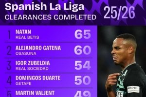 體育資訊10月7日訊 日前,Squawka統(tǒng)計(jì)了本賽季西甲解圍次數(shù)排行,貝蒂斯后衛(wèi)納坦65次居首,祖貝迪亞54次第三。