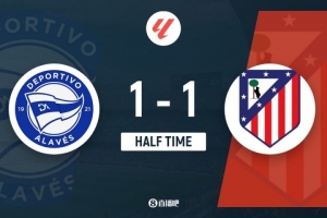上半場(chǎng)比賽結(jié)束,馬德里競(jìng)技客場(chǎng)暫時(shí)1-1戰(zhàn)平阿拉維斯。
