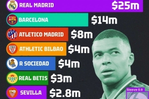 體育資訊10月8日訊 Sponsorlytix統(tǒng)計了西甲各隊每年的衣袖廣告收入,并列出榜單,皇馬2500萬美元居首,巴薩1400萬美元次席。