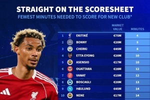 體育資訊10月8日訊 德國轉(zhuǎn)會市場統(tǒng)計(jì)了今夏新援攻入處子球的時(shí)間,并排出最快處子球榜單,埃基蒂克4分鐘攻入首球居首。