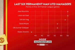 體育資訊10月9日訊 加盟曼聯(lián)以來,阿莫林已經(jīng)率隊踢了34場英超比賽,但他的執(zhí)教表現(xiàn)遠(yuǎn)遠(yuǎn)沒能達(dá)到外界的期望。根據(jù)天空體育的數(shù)據(jù)統(tǒng)計,阿莫林前34場英超比賽僅僅拿到37分,低于之前數(shù)位曼聯(lián)主帥所拿到的積分。
