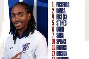 英格蘭首發(fā):1-皮克福德、2-孔薩、5-斯通斯、6-格伊、14-斯賓塞、17-戈登、15-羅杰斯、4-賴斯、21-安德森、7-薩卡、19-沃特金斯
