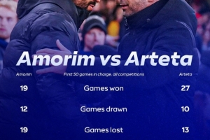 體育資訊10月11日訊 天空體育對比了阿莫林執(zhí)教曼聯(lián)前50場比賽,與阿爾特塔執(zhí)教阿森納的前50場戰(zhàn)績對比,具體如下(各項賽事):