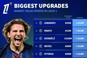 體育資訊10月12日訊 德國轉(zhuǎn)會市場更新法甲球員的身價,并列出身價上漲榜單,扎巴爾尼+1300萬歐居首,巴黎球員占據(jù)前7名。