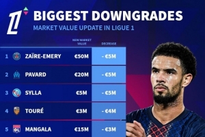 體育資訊10月12日訊 德國(guó)轉(zhuǎn)會(huì)市場(chǎng)更新了法甲球員的身價(jià),并列出身價(jià)下跌排名,扎伊爾-埃梅里、帕瓦爾、西拉-500萬歐居首。