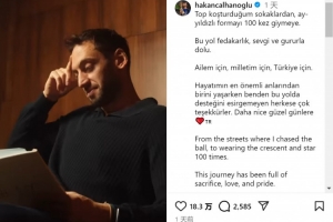 恰爾汗奧盧達(dá)成國家隊出戰(zhàn)100場里程碑,他在社交媒體上寫道:“從在街頭追逐足球,到身披星月戰(zhàn)袍(土耳其隊球衣)出戰(zhàn)百場。這段旅程充滿了犧牲、熱愛與驕傲。為我的家人,為我的祖國,為土耳其?!?/p>