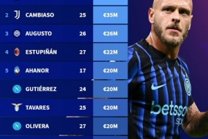 3、奧古斯托(國(guó)際米蘭),26歲,2600萬(wàn)歐元