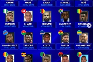 以下為非洲各國(guó)歷史身價(jià)最高球員具體身價(jià)情況: