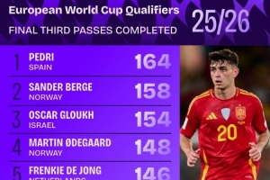 體育資訊10月15日訊 Squawka列出了歐洲世預(yù)賽進攻三區(qū)成功傳球排名,西班牙中場佩德里居首。