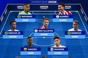 中場(chǎng):凱塞多(9000萬(wàn)歐)、巴爾韋德(1.3億歐)、麥卡利斯特(1億歐)