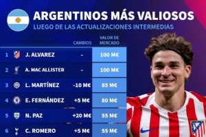 體育資訊10月18日訊 德國轉會市場更新了部分球員的身兼,并列出阿根廷球員德轉身價排名,阿爾瓦雷斯、麥卡利斯特1億歐居首。