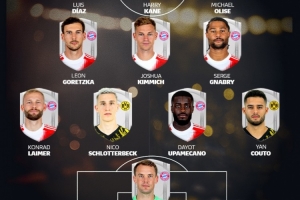 體育資訊10月18日訊 本輪德甲將上演焦點(diǎn)對決拜仁對陣多特,德甲官方也通過球迷票選評(píng)選出雙方最佳11人陣容,其中凱恩領(lǐng)銜拜仁9人在列,具體如下:
