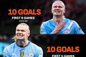 哈蘭德本場(chǎng)比賽的第1個(gè)進(jìn)球幫助他本賽季的聯(lián)賽進(jìn)球達(dá)到了10個(gè),成功上雙,而據(jù)統(tǒng)計(jì),能夠在英超前8輪比賽中實(shí)現(xiàn)進(jìn)球上雙的球員只有一位,正是哈蘭德。