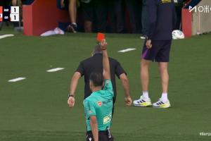 比賽補(bǔ)時(shí)階段,弗里克不滿裁判,兩黃變一紅被罰下,他將無緣下輪的國(guó)家德比。