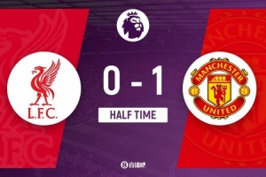 上半場(chǎng)傷停補(bǔ)時(shí)4分鐘,半場(chǎng)結(jié)束,利物浦暫0-1曼聯(lián)。
