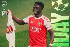 賽前,阿森納官方曬出海報(bào),為本場(chǎng)比賽預(yù)熱。薩卡單人出鏡,海報(bào)左上角為對(duì)陣雙方隊(duì)徽,右上角為歐冠標(biāo)志。