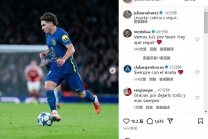 馬競(jìng)前鋒阿爾瓦雷斯此役踢滿全場(chǎng),賽后他在社交媒體上曬出比賽照片,配文:“抬起頭,繼續(xù)前進(jìn)?!?/p>