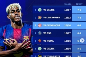體育資訊10月22日訊 在本輪歐冠,巴薩6-1大勝奧林匹亞科斯。德轉(zhuǎn)也盤點(diǎn)了巴薩隊(duì)史在歐冠最大比分獲勝紀(jì)錄榜,具體如下: