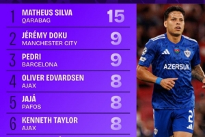 體育資訊10月23日訊 本賽季歐冠聯(lián)賽階段已戰(zhàn)罷3輪,Squawka統(tǒng)計(jì)了到目前為止的被犯規(guī)榜單,卡拉巴赫后衛(wèi)馬修斯-席爾瓦15次第一,曼城邊鋒多庫和巴薩中場佩德里均9次,分列二三位。