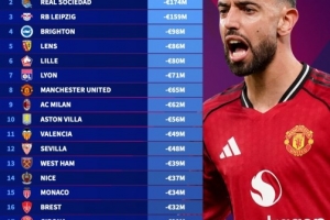 8、曼聯(lián):-6500萬(wàn)歐