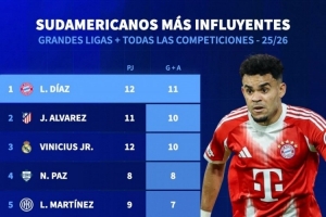 體育資訊10月24日訊 德國(guó)轉(zhuǎn)會(huì)市場(chǎng)統(tǒng)計(jì)了本賽季五大聯(lián)賽南美球員的參與進(jìn)球數(shù)量,并列出榜單,路易斯-迪亞斯參與11球居首,阿爾瓦雷斯、維尼修斯參與10球次席。