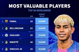 體育資訊10月25日訊 德國轉(zhuǎn)會市場列出了球員身價前50排名,亞馬爾2億歐居首,貝林厄姆、哈蘭德、姆巴佩1.8億歐次席。