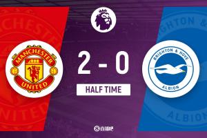 上半場(chǎng)傷停補(bǔ)時(shí)1分鐘,半場(chǎng)結(jié)束,曼聯(lián)暫2-0布萊頓。