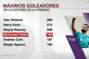 據(jù)ESPN統(tǒng)計(jì),薩拉赫目前在英超打進(jìn)189球,排名歷史射手榜第四位,差19球追平排名第三的魯尼。