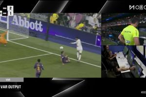 體育資訊10月27日訊 西甲第10輪國家德比,皇馬對陣巴薩。48分鐘,貝林厄姆傳中,皮球反彈打到加西亞手上。皇馬球員抗議手球,裁判沒有判罰。VAR介入,裁判親自觀看回放判罰點(diǎn)球,姆巴佩主罰點(diǎn)球被撲