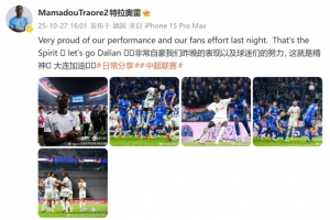 賽后,馬馬杜-特拉奧雷在社媒寫道:“非常自豪我們昨晚的表現(xiàn)以及球迷們的努力, 這就是精神!大連加油!”