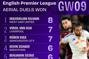 英超第9輪贏得空中對抗次數(shù)榜:基爾曼8次最多,范戴克等兩人7次