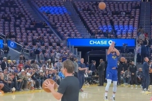 賽前熱身環(huán)節(jié),勇士球星庫(kù)里在中圈出手,皮球精準(zhǔn)入筐。