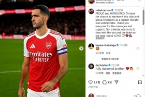 梅里諾寫(xiě)道:“自豪與榮幸!今晚能有機(jī)會(huì)作為隊(duì)長(zhǎng)代表這家俱樂(lè)部和這群球員出戰(zhàn),感覺(jué)難以置信。感謝所有人的留言和支持,沒(méi)有比用一場(chǎng)勝利和晉級(jí)下一輪更好的方式來(lái)慶祝了,槍手加油!????????”