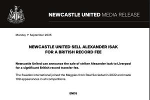 紐卡官網(wǎng)的聲明:“紐卡斯?fàn)柭?lián)宣布將前鋒亞歷山大-伊薩克以創(chuàng)英國轉(zhuǎn)會費紀(jì)錄的價格出售給利物浦。這位瑞典國腳于2022年從皇家社會轉(zhuǎn)會至喜鵲,并在各項賽事中出場109次。”