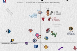 橫軸代表進(jìn)攻效率,越靠右越好,縱軸代表防守效率,越靠上越強(qiáng)。