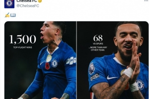 本場比賽也是切爾西隊史收獲的第1500場頂級聯(lián)賽勝利,其中對陣熱刺68場勝利是所有對手中最多的,藍軍官推也曬出海報紀念達成這一里程碑時刻。