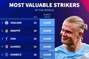體育資訊11月3日訊 德轉(zhuǎn)列當前世界足壇中鋒身價排行,哈蘭德、姆巴佩1.8億歐并列最高,伊薩克1.4億歐,阿爾瓦雷斯、登貝萊1億歐。
