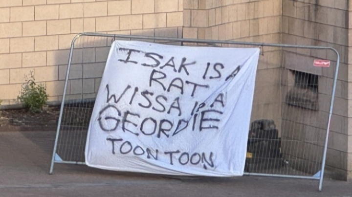 標(biāo)語上寫著,Isak is a rat, Wissa is a Geordie, Toon Toon.(翻譯參考:伊薩克是叛徒,維薩是自家人,紐卡!紐卡!)
