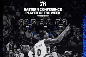 上周馬克西率領(lǐng)76人取得3勝1負(fù)的戰(zhàn)績(jī),場(chǎng)均轟下33.5分5.3籃板9.8助攻。
