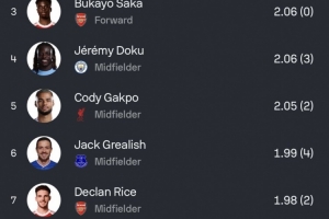 本賽季英超預(yù)期助攻排名(括號(hào)內(nèi)為實(shí)際助攻):