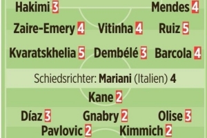 體育資訊11月5日訊 巴黎在本輪歐冠焦點(diǎn)戰(zhàn)主場(chǎng)1-2不敵拜仁,馬爾基尼奧斯送禮、迪亞斯雙響后染紅,《圖片報(bào)》在賽后為兩隊(duì)進(jìn)行了評(píng)分: