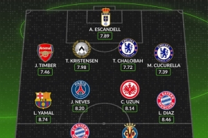 后衛(wèi):廷伯(阿森納,7.46分)、T-克里斯滕森(烏迪內(nèi)斯,7.18分)、查洛巴(切爾西,7.72分)、庫庫雷利亞(切爾西,7.39分)
