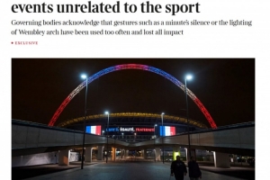 英足總、英超聯(lián)賽和英格蘭足球聯(lián)賽成立了“世界事件工作組”(WEWG),以指導(dǎo)英格蘭足球?qū)χ卮笫澜缡录姆磻?yīng)。除非事件與足球有直接關(guān)聯(lián),否則聯(lián)賽將不會(huì)舉行默哀儀式,也不會(huì)點(diǎn)亮溫布利球場(chǎng)的拱門。