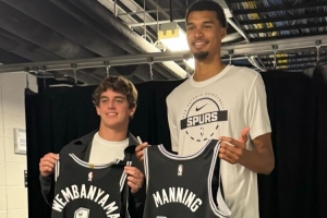 本場比賽,德克薩斯大學(xué)橄欖球隊球員阿奇·曼寧等人現(xiàn)場觀看了本場比賽,并受到了文班亞馬及??怂沟慕哟?。星三代阿奇·曼寧還和文班互換了球衣。