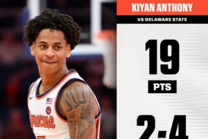 此役,卡梅隆·安東尼之子、雪城大學(xué)后衛(wèi)基揚·安東尼迎來大學(xué)生涯第一次首發(fā),他表現(xiàn)十分高效,全場上陣29分鐘11投8中,三分4中2、罰球4中1,砍下19分3籃板4助攻1搶斷,沒有失誤。
