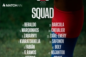 體育資訊11月9日訊 北京時(shí)間明天凌晨,巴黎將在法甲第12輪比賽中客場(chǎng)對(duì)陣?yán)锇?,巴黎公布了此役的球員名單,阿什拉夫、登貝萊、努諾-門德斯、杜埃缺席。