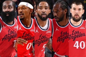 本賽季快船最常用的陣容是哈登、比爾、小瓊斯、萊昂納德和祖巴茨組成的首發(fā)陣容。這陣容在9場比賽中出場63分鐘,進攻效率120.9,防守效率為131.8,凈效率為-10.9。