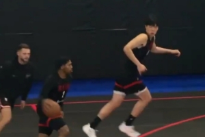 視頻當(dāng)中,楊瀚森接球上籃打進,開拓者眾將輕松備戰(zhàn)氛圍融洽。