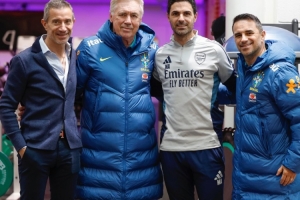 巴西隊在阿森納基地進(jìn)行訓(xùn)練,安切洛蒂訓(xùn)練之前與阿爾特塔合影,巴西隊社媒曬出照片。