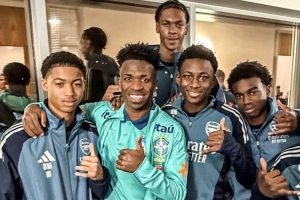 維尼修斯隨巴西隊(duì)在阿森納基地訓(xùn)練,備戰(zhàn)這場友誼賽,他與阿森納的青訓(xùn)球員合影。